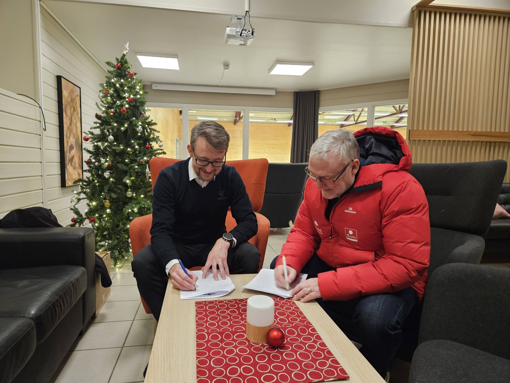 Øyvind Bertelsen-Tangvik fra Bertelsen AS og Bård Inge Romundstad fra Rindal IL signerer avtalen.